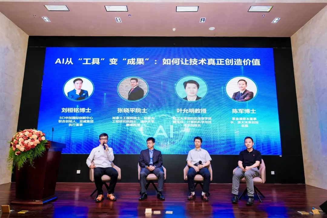 在圓桌對話環節,加拿大工程院院士、清華大學深圳研究生院張曉平、哈爾濱工業大學(深圳)計算機科學與技術學院院長葉允明、紫金港資本董事長陳軍、SCI中加國際創新中心(南粵僑創基地)聯合創始人劉桓銘博士等嘉賓圍繞“如何讓技術真正創造價值”這一議題展開多維話題探討。張曉平院士指出,AI技術從實驗室走向市場的關鍵在于場景精準定義與數據深度治理;葉允明院長以智慧氣象為例,垂直領域落地面臨數據質量、基礎算法、行業深度等跨學科協同創新是突破技術轉化壁壘的核心路徑;陳軍董事長從長期資本視角提出,投資生態對AI技術產業化至關重要,不同區域投資人對風險容忍度不同,資本在轉化中角色多元是當前AI項目投資的核心考量;劉桓銘博士則結合南粵僑創基地實踐,分享了“技術孵化-場景對接-資本賦能”的全鏈條服務模式。