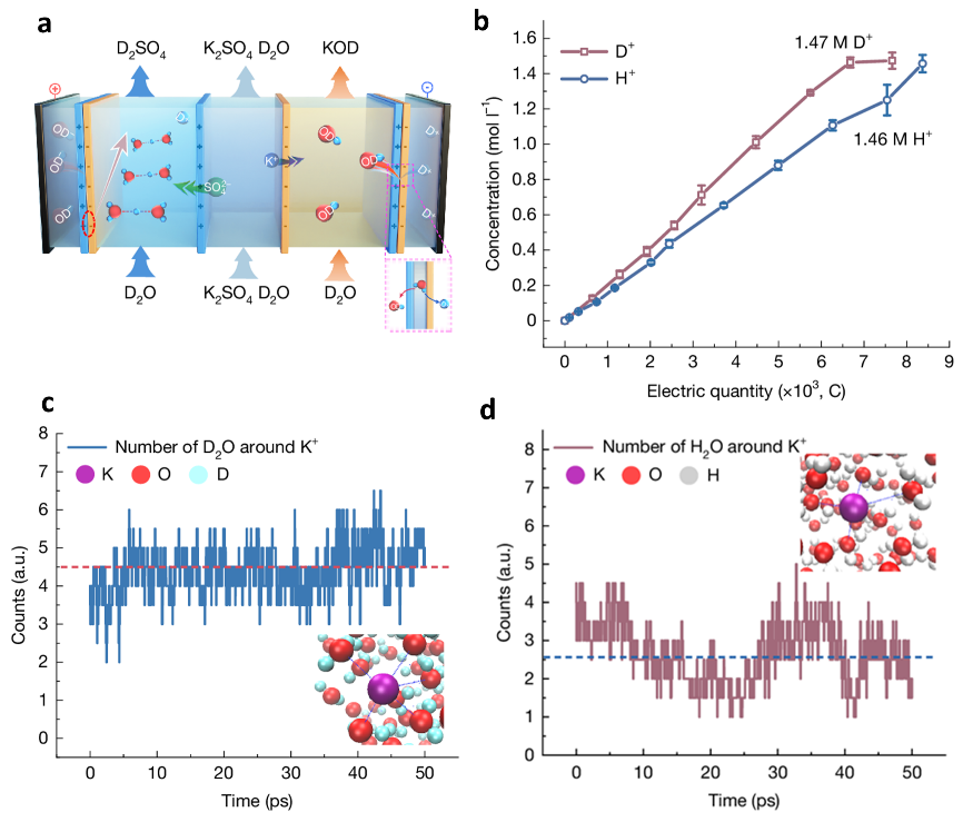 近日,中國科學技術大學精準智能化學全國重點實驗室徐銅文教授、汪耀明特任教授和李震宇教授團隊聯合攻關,在氘代化學品制備領域取得突破性進展。研究團隊創新性地利用雙極膜實現重水高效解離,發現了核量子效應導致膜層內氘離子遷移速率反超氫離子的現象,顛覆了長期以來“重水解離速率比水慢”的傳統認知,并成功開發出低成本制備氘代酸堿的新技術。7月9日,該重要研究成果在線發表于《自然》(Nature)。