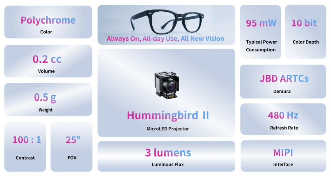 JBD公司表示:“蜂鳥Ⅱ是我們在消費級AR領(lǐng)域的一項關(guān)鍵突破,它將彩色顯示融入極致尺寸之中,延續(xù)了JBD在MicroLED光引擎小型化、低功耗、高亮度方面的領(lǐng)先優(yōu)勢。依托JBD在近眼顯示領(lǐng)域的不斷創(chuàng)新,蜂鳥Ⅱ為輕量化全彩AR智能眼鏡打開了全新增長曲線。”
