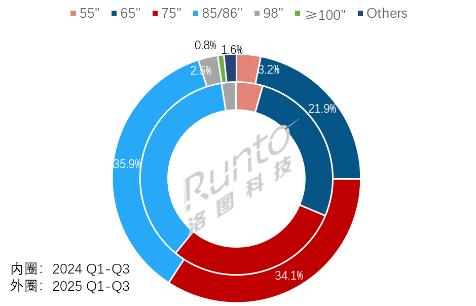 86寸、75寸、65寸三大主流尺寸的統治力依然穩固,前三季度的累計出貨量份額合計達90.5%。其中,75寸的需求增長最為顯著,份額同比增長了4.5個百分點至34.1%;尤其在第三季度,其單季份額飆升至39.9%,也由此拉低了全年平均尺寸。該尺寸段產品主要由BOE和CSOT供貨,比例大致為65:35。