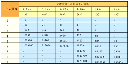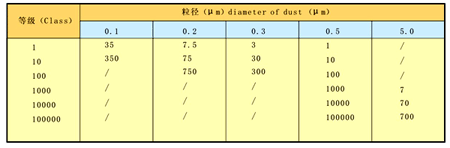 注:①每個采樣點應至少采樣3次; ②本標準不適用于表征懸浮粒子的物理性、化學性、放射性及生命性; ③根據工藝要求確定1~2種粒徑; ④各種要求粒徑D的粒子最大允許濃度Cn由公式確定,要求的粒徑在0.1~5μm范圍,包括0.1μm及5μm。 式中:Cn——大于或等于要求粒徑的粒子最大允許濃度(pc/m3)。Cn是以四舍五入到相近的整數,有效位數不超過三位數。 N——潔凈度等級,數字不超出9,潔凈度等級整數之間的中間數可以按0.1為最小允許遞增量。 D——要求的粒徑(μm)。 0.1——常數,其量綱為μm。 美國聯邦標準