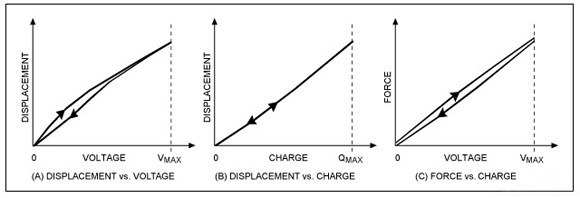 當(dāng)對(duì)壓電體施加電壓時(shí),由于極板間距離發(fā)生變化(圖3A),電容量也會(huì)隨之改變。壓電體位移正比于電場(chǎng)強(qiáng)度,而電場(chǎng)強(qiáng)度是極板間電壓和距離的函數(shù)。外加電壓和壓電驅(qū)動(dòng)器產(chǎn)生的作用力保持著合理的正比關(guān)系(圖3C)。