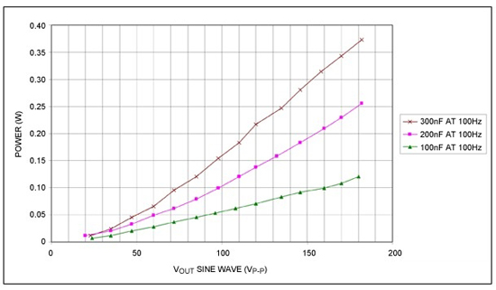 圖9A. 100Hz連續(xù)正弦波下,功耗隨負(fù)載的變化曲線