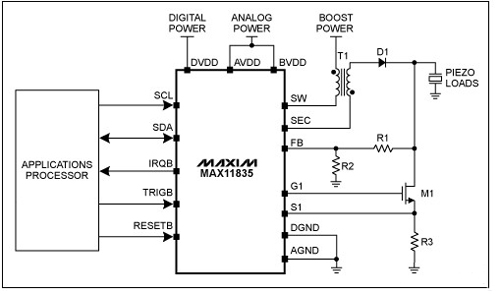單芯片觸覺(jué)反饋方案,如 MAX11835相比于傳統(tǒng)分立設(shè)計(jì)有很多優(yōu)勢(shì):較小的印制電路板尺寸、較低功耗、精簡(jiǎn)的材料清單(BOM)以及簡(jiǎn)單的軟件支持。考慮到壓電體尺寸也很小, MAX11835對(duì)于手持設(shè)備是極具吸引力的解決方案。