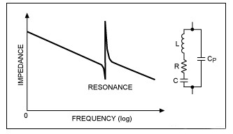 壓電體中運(yùn)轉(zhuǎn)的電機(jī)系統(tǒng)可以用主介質(zhì)電容CP并聯(lián)由LRC組成的串聯(lián)網(wǎng)絡(luò)來(lái)模擬(圖4)。達(dá)到諧振頻率之前,阻抗會(huì)像電容一樣隨頻率上升而下降。所以,當(dāng)壓電體工作在遠(yuǎn)低于諧振頻率時(shí),可以僅用一個(gè)電容CP來(lái)模擬。