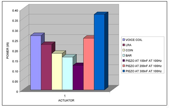 圖14顯示了連續(xù)工作的功耗。圖中壓電體由幅度為180V、頻率為100Hz的連續(xù)正弦波驅(qū)動(dòng)。其它驅(qū)動(dòng)器由3VDC或2VRMS (LRA 和音圈)驅(qū)動(dòng)。