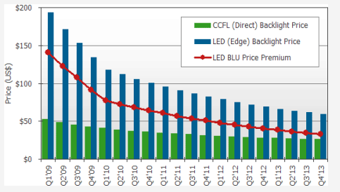 圖一2009年第一季度--2013年第四季度40寸全高清液晶電視面板用CCFL與LED背光板價格趨勢