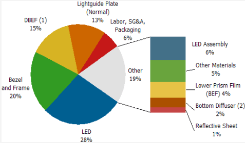 由圖二可知以40寸液晶電視LED背光模塊而言,主要成本構(gòu)成有LED芯片、導光板(LGP,lightguideplate)以及增亮膜(DBEF,dualbrightnessenhancementfilm),而在傳統(tǒng)傳統(tǒng)的CCFL背光液晶電視并沒有使用到這三項元器件。其中關(guān)于LED燈源部份(不包括LED芯片)就占了整個背光模塊34%成本,估計導光板占13%、增亮膜占15%、LED組裝占6%;由此我們清楚地知道LED背光設(shè)計、輸出效率以及芯片成本將是降低LED背光板成本主要方向。